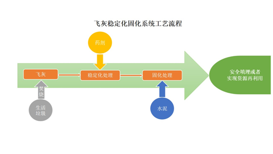 實現(xiàn)手段:“飛灰+螯合劑+水+水泥”進行混合攪拌,根據(jù)項目特點設(shè)定具體的配比值和附加工藝,可設(shè)置多條生產(chǎn)線組合的生產(chǎn)工藝,以滿足飛灰產(chǎn)生量比較大的項目。